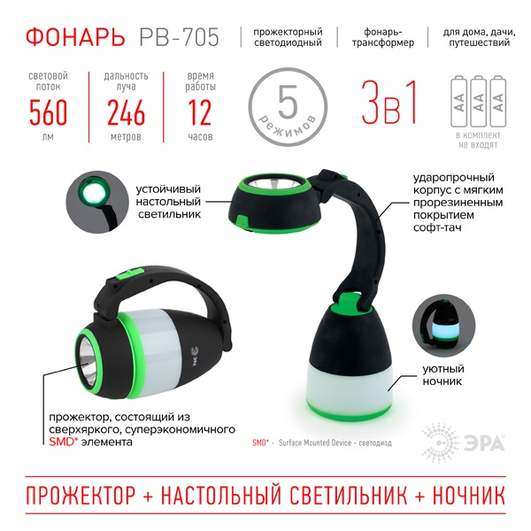 ЭРА РB-705 - многофункциональный светодиодный фонарь-трансформер в ударопрочном корпусе с мягким прорезиненным покрытием софт-тач. Выбирайте любой из трех режимов работы: компактный ручной прожектор, устойчивый настольный светильник и уютный ночник. Настольный светильник и ночник имеют два режима освещения: яркий режим и ровный неяркий свет. Необычный округлый дизайн фонаря, приятный на ощупь материал, стильные салатовые детали оценят и взрослые и дети. ЭРА PB-705 идеален для дома, дачи, путешествий. Станет отличным помощником на отдыхе и в быту. Фонарь очень легок по весу и прост в управлении. Работает от 3 пальчиковых батареек. От одного комплекта элементов питания непрерывно светит 12 часов.