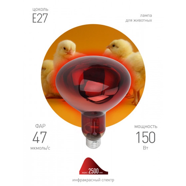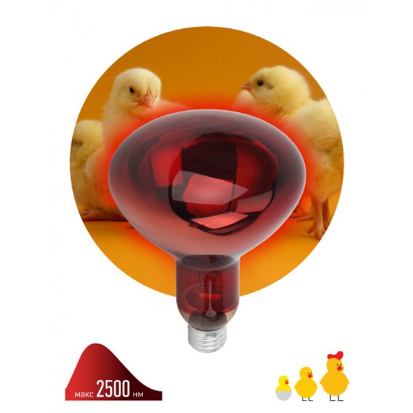 Инфракрасная зеркальная лампа с красной колбой. Активно используется в животноводстве, птицеводстве и растениеводстве. Максимальная тепловая мощность без яркого света. Идеальна для стабилизации теплового баланса новорождённых и молодых животных. 100 % энергии переходит в тепловую. Работа лампы не зависит от скачков сети, микроимпульсов. Не требуются стабилизаторы напряжения – лампа работает даже при пониженном напряжении. Мгновенно включается и нагревается. Минимум пульсаций освещения. Компактные размеры (удобно при транспортировки и использовании). Используется только с керамическими цоколями (не с пластиковыми!).