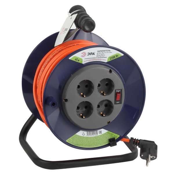 Удлинитель бытовой на пластиковой катушке длиной 40 метров, с сечением 3x1 мм2, 4 розетки с заземлением, с тепловой защитой, Эра. Б0043055