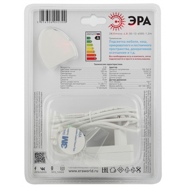 Комплект одноцветной светодиодной ленты с датчиком движения. 12 В, 4,8 Вт/м, цветовая температура 6500 К. Длина ленты 1,2 м. Тип светодиода 2835, 30 LED/м. В составе комплекта: LED лента на двустороннем скотче, источник питания, датчик движения. Датчик срабатывает только в условиях низкой освещенности. Идеально подходит для подсветки лестничных и прикроватных пространтств, проходных помещений. Внимание: во избежание выхода из строя не допускается длительная работа ленты в смотанном виде!