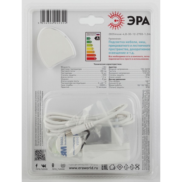 Комплект одноцветной светодиодной ленты с датчиком движения. 12 В, 4,8 Вт/м, цветовая температура 2700 К. Длина ленты 1,2 м. Тип светодиода 2835, 30 LED/м. В составе комплекта: LED лента на двустороннем скотче, источник питания, датчик движения. Датчик срабатывает только в условиях низкой освещенности. Идеально подходит для подсветки лестничных и прикроватных пространтств, проходных помещений. Внимание: во избежание выхода из строя не допускается длительная работа ленты в смотанном виде!