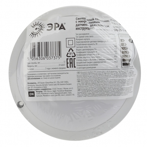 Пылевлагозащищенный светодиодный светильник ЭРА ЖКХ, мощностью 8 Ватт, нейтральный белый свет, с датчиком движения Б0043083