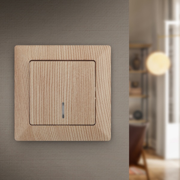 Стильный и функциональный выключатель из серии Intro Solo выполнен в элегантном оттенке "сосна", органично вписывается в интерьер с элементами из дерева или в тёплой природной палитре.