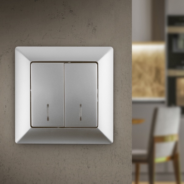 Двухклавишный выключатель с подсветкой для скрытого монтажа в сухих помещениях, цвета алюминий, Intro серии Solo. Б0043293