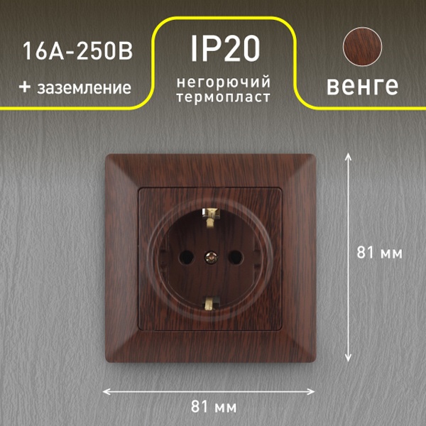 Корпус розетки выполнен в элегантном цвете венге, который идеально подходит для современного интерьера, придавая помещению стильный и благородный вид. Это решение будет гармонично смотреться как в интерьерах в классическом, так и в современном стилях, в том числе в комнатах, оформленных в темных или натуральных оттенках. Матовое покрытие розетки имеет высокую стойкость к механическим повреждениям, не подвержено выцветанию и сохраняет свой первоначальный внешний вид на протяжении долгого времени.