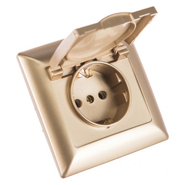 Электрическая розетка с заземлением, защитными шторками и крышкой для скрытого монтажа в сухих помещениях, цвета шампань, Intro серии Solo. Б0043322