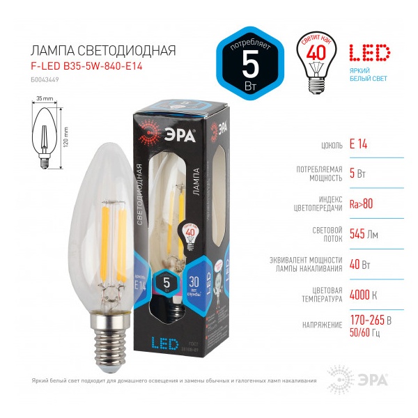 Характеристики:- Мощность: 5 Вт (Эквивалент мощности 40 Вт)