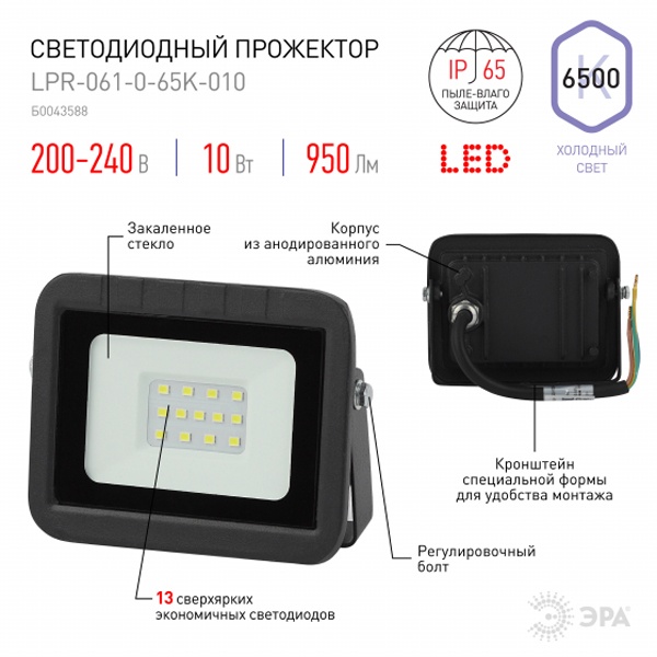 • Прожектор светодиодный ЭРА LPR-061-0-65K-010 10W 6500K 950Lm IP65