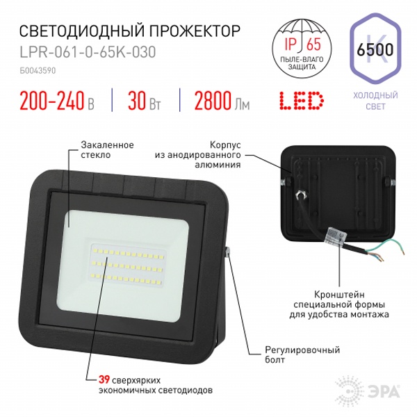 • Прожектор светодиодный ЭРА LPR-061-0-65K-030 30W 6500K 2800Lm IP65