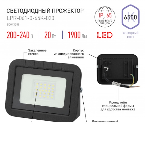Б0043590 Прожектор светодиодный ЭРА LPR-061-0-65K-030 30W 6500K 2800Lm IP65 фото 13