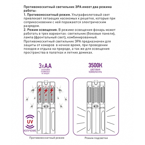 - Имеет два режима работы: противомоскитный и режим освещения.
