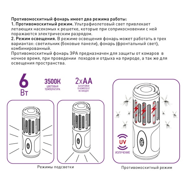 Противомоскитный батареечный фонарь с боковыми панелями - эффективное средство в борьбе с насекомыми. Может использоваться как ручной фонарь с фронтальным направленным светом, а также как настольный светильник с широким заливающим освещением. Режимы можно комбинировать. Есть крючок для подвешивания.