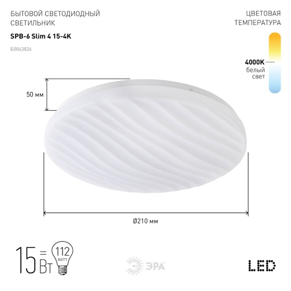 Светодиодный потолочный светильник SPB-6 "Slim 4" мощностью 15 Вт от компании ЭРА – идеальное решение для любого интерьера! Благодаря неповторимому дизайну и небольшим габаритам данная люстра гармонично впишется как в большое, так и маленькое пространство. Одним из главных преимуществ данного LED светильника является его свечение. Нейтрально холодно-белый оттенок светодиода (4000 К) и пластиковая поверхность рассеивателя успокаивают глаза и защищают от воздействия прямого света. Потолочную люстру отличает неповторимый дизайн плафона. Рельефная декорация в сочетании с круглым плоским корпусом создает ощущение движения воды. Электросветильник SPB-6 "Slim 4" придаст свежести интерьеру спальни, гостиной или коридора. I класс защиты и срок службы в 30 000 лет позволят Вам долго наслаждаться светодиодной люстрой и получать истинное удовольствие от гармонии в помещении!