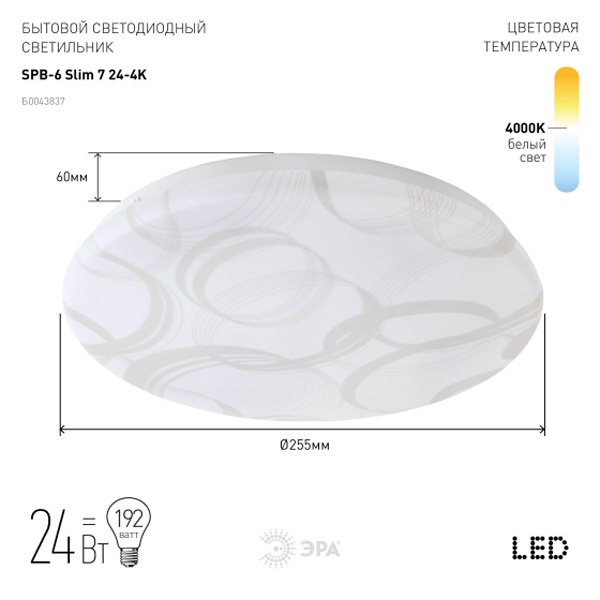 LED Светильник настенно-потолочный ЭРА Slim 7 24-4K, 24Ватт 4000K 1800Лм Б0043837