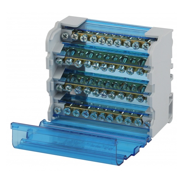 Шины выполнены из высококачественной латуни, изолирующая задняя панель и прозрачная защитная крышка выполнены из самозатухающего пластика. Применяются при комплектации щитового оборудования для подсоединения нулевого провода, провода заземления и фазных проводников.