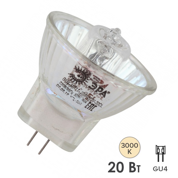 Галогенная лампочка ЭРА направленного света, напряжением 220 Вольт, мощностью 20 Ватт, с цоколем GU4 Б0044093