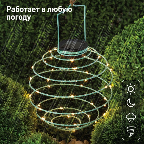 Садовый подвесной светильник на солнечной батарее «Спираль» производителя ERA – это идеальное решение для украшения террас и деревьев. Он необычно стилизует любое уличное пространство. Легкая воздушная конструкция спирали в виде шара со светящимися огоньками выполнена из пластика, имеет простое крепление, ее высота – 22 см . Небольшие размеры позволяют расположить подсветку в саду, подвесить на дерево, изящно подсветить вход в террасу, дом или фасад. Садовый светильник функционирует на солнечной батарее. Питание происходит во включенном режиме, в светлое время суток. После захода солнца спираль начинает светиться теплым желтым светом. Необычный дизайн придает устройству динамики и создает праздничную обстановку. Работа от солнечной батареи рассчитана на 8 часов непрерывной работы. ПВХ в составе светильника обеспечивает высокую степень защиты от пыли и влаги, а также устойчивость к механическим повреждениям. Декоративный светильник рассчитан для применения на улице при любых погодных условиях и имеет степень защиты от влаги и пыли – IP44. Источник света – 45 ламп LED. Гарантийный срок устройства – 6 месяцев. Срок службы – 2 года.