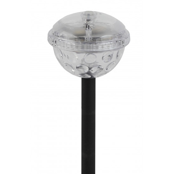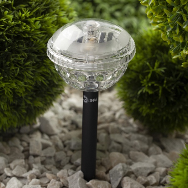 Декоративный садовый светильник «Дискошар» на солнечной батарее торговой марки Era имеет два варианта расположения: его можно установить на пике, либо просто положить на ровную поверхность. В зависимости от установки, вы получите разные варианты освещения. Устройство представляет собой легкую конструкцию из пластика типа боллард в виде шара диаметром 10 см на колышке. Рифленая поверхность плафона обеспечивает оригинальное свечение и красивые блики на освещаемой поверхности. Источником света служит светодиодная лампа мощностью 2 Ватта. Уличный светильник работает на солнечной батарее. Питание происходит во включенном режиме, в течение всего светового дня. Подсветка реагирует на недостаток света и сама загорается с наступлением темноты. Солнечная батарея предусматривает 8 часов непрерывной работы. Высокая степень защиты от пыли и влаги IP44 позволяет оставлять светильник на улице даже во время непогоды. Гарантия изделия – 6 месяцев. Срок службы – 2 года.