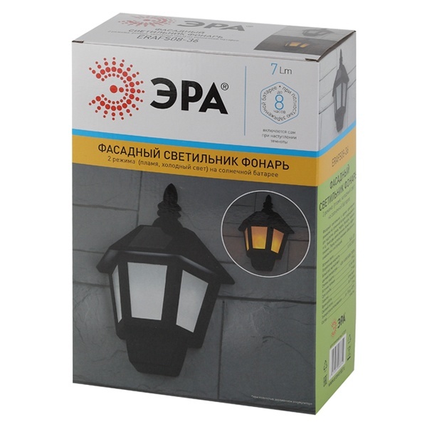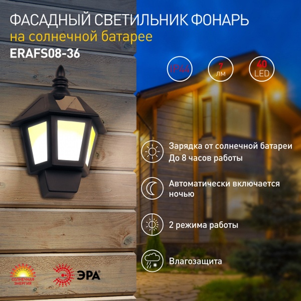 ERAFS08-36 ЭРА Фасадный светильник Фонарь,2 режима(огонь,холодный свет),на солн. бат.,40LED,7lm (12/