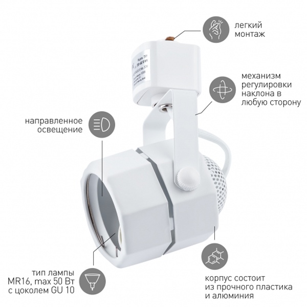 • Светильник трековый однофазный ЭРА TR9-GU10 WH под лампу MR16 белый