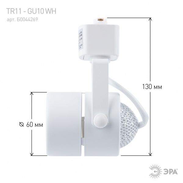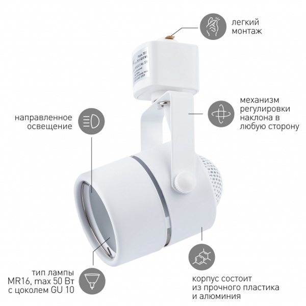 Современный трековый светильник отечественного производителя Эра имеет круглую форму и выполнен в универсальном белом цвете. Он является отличным решением для освещения жилых помещений и обеспечит качественную подсветку стеллажей или витрин. Прибор гарантирует направленное освещение, легко монтируется, а благодаря наличию специального поворотного механизма может регулировать световой поток в любом направлении, чем обеспечивает световое зонирование пространства. Материалом корпуса изделия выступают прочный пластик и алюминий. Устройство предназначено для работы в сети с напряжением 230 Вольт с частотой 50 Герц. Подходящий источник питания – галогенная или LED-лампа типа MR16. Тип цоколя – GU10, максимальная мощность – 50 Ватт. Размеры прибора: высота – 130 мм, диаметр – 60 мм, вес – 0,19 кг. Средний номинальный срок службы устройства составляет 30 000 часов. Степень защиты светильника – IP20. Класс защиты – II. Гарантийный срок устройства – 2 года. Преимуществом данной модели является лаконичный и стильный дизайн, который прекрасно впишется в любой интерьер. Установка и крепление светильника производятся на однофазный шинопровод при помощи соответствующих замков на основании прибора.