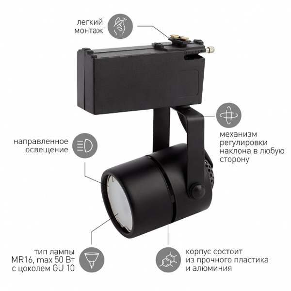 Компактный трековый светильник круглой формы от отечественного производителя Эра применяется для общего и акцентного освещения внутри жилых и коммерческих помещений. Он обеспечивает направленный поток света, легко монтируется и обладает поворотным механизмом, регулирующим наклон прибора в любую сторону. Светильник предназначен для галогенных или светодиодных ламп типа MR16 с цоколем GU10 и максимальной мощностью до 50 Ватт. Работает от бытовой сети с напряжением 230 Вольт с частотой 50 Герц. Преимуществом этой модели является лаконичный и стильный дизайн, который прекрасно впишется в современный интерьер и позволит обеспечить световое зонирование пространства. Корпус изделия выполнен из прочного пластика и алюминия в черном цвете. Его установка предусмотрена на однофазный шинопровод. Крепление производится при помощи соответствующих замков на основании прибора. Габаритные параметры: высота – 130 мм, диаметр – 60 мм. Вес – 0,19 кг. Степень защиты– IP20. Класс защиты – II. Гарантийный срок производителя составляет 2 года. Срок службы соответствует 30 000 ч. В комплект входит руководство по эксплуатации и монтажу. Лампа приобретается отдельно.