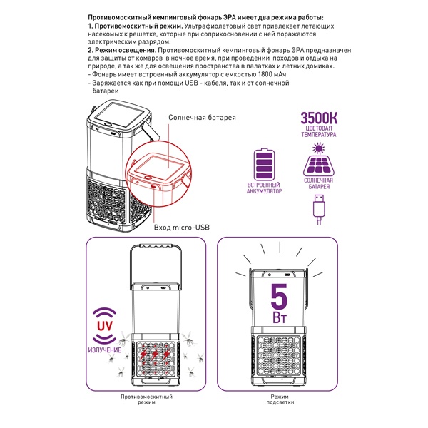 Противомоскитный кемпинговый фонарь ЭРА ERAMF-08 предназначен для защиты от комаров и мошек в ночное время, в походах, отдыхе на природе, а также для освещения в палатках и летних домиках.