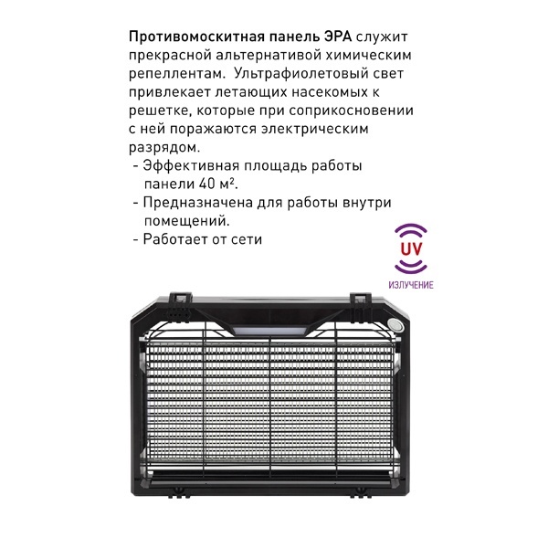 Противомоскитная панель ЭРА служит прекрасной альтернативой химическим репеллентам. Ультрафиолетовый свет привлекает летающих насекомых к решетке, при соприкосновении с которой они поражаются электрическим разрядом.