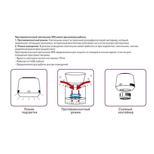 Противомоскитный режим: встроенный ультрафиолетовый светодиод привлекает летающих насекомых, встроенный вентилятор затягивает их во внутренний отсек светильника.