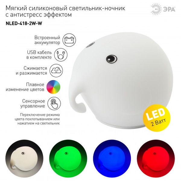 Мягкие светильники-ночники ЭРА из силикона с приятным на ощупь покрытием софт-тач имеют милый дизайн в виде фигурок животных и популярны как среди детей, так и среди взрослых. Режим плавной смены цветов завораживает, оказывает успокаивающий эффект, помогает бороться со стрессом и быстро засыпать. На эти светильники радостно смотреть, их приятно держать в руках. Они трогательные во всех смыслах - речь и о необычном оформлении корпуса, и о сенсорном способе управления. Пара прикосновений или лёгкое постукивание - и вот ночник уже изменил цвет свечения или режим работы.