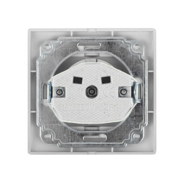 Розетка электрическая с заземляющим контактом для установки скрыто в монтажные коробки на распорные лапки, либо винты. Накладка и рамка выполнены из негорючего пластика. Механизм изготовлен из керамики стойкой к температурам.