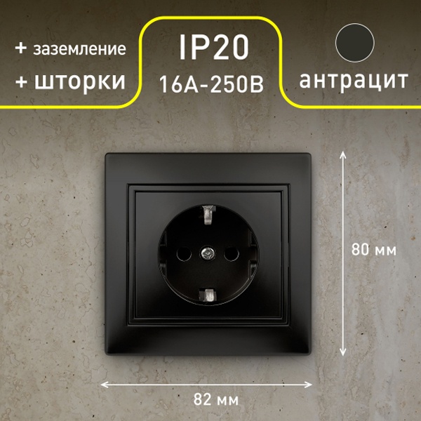 Розетка электрическая с заземляющим контактом и защитными шторками для установки скрыто в монтажные коробки на распорные лапки, либо винты. Накладка и рамка выполнены из негорючего пластика. Механизм изготовлен из керамики стойкой к температурам.