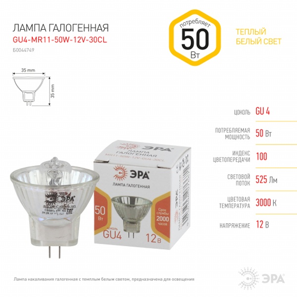 Низковольтная, галогенная лампочка ЭРА направленного света, напряжением 12 Вольт, мощностью 50 Ватт, с цоколем GU4 Б0044749