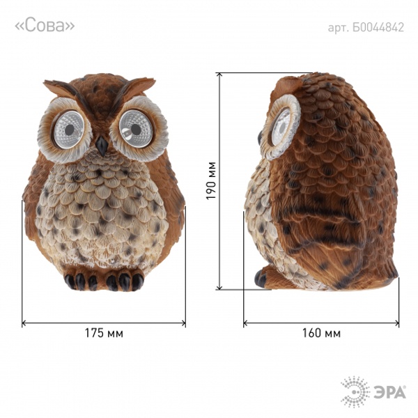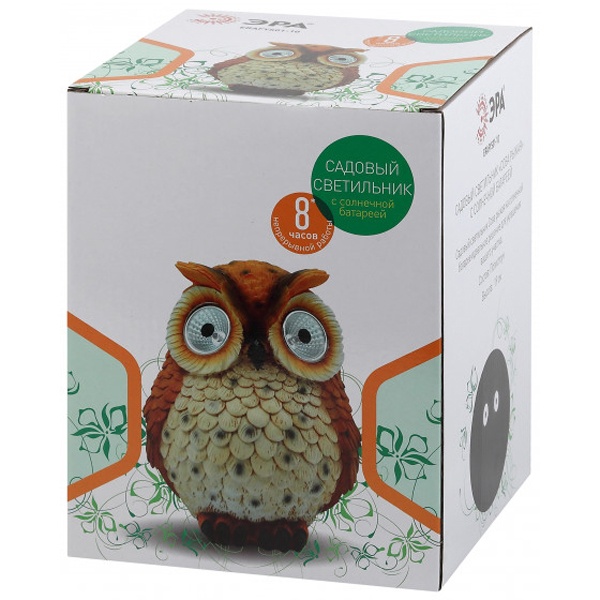Садово-парковый светильник ERAFYS01-10 "Рыжая сова" станет эффектным обитателем Вашего участка.Небольшие размеры позволят разместить светильник в палисаднике, украсить пруд, веранду, кустарник, изящно подсветить аллею или вход в дом. Фигурка из искусственного камня высотой 19 см с легкостью устанавливается в землю.LED светильник функционирует на солнечной батарее. Такой способ получения энергии является самым экологичным, энергоемким, а также бесшумным. Питание происходит во включенном режиме, днем. С наступлением ночи забавная рыжая сова просыпается. Участок вокруг нее начинает освещаться белым светом, исходящим из глаз. Создается сказочная атмосфера. Кроме того, четкая проработка деталей фигурки делает ее максимально реалистичной. Обращаем Ваше внимание, что перед использованием фигурки её необходимо включить и зарядить. Светильник заряжается в течение всего светового дня.Работа от солнечной батареи предусматривает 8 часов непрерывной работы. Высокая степень защиты от пыли и влаги позволяет оставлять светильник на улице даже во время дождя.Декоративный светильник от компании ЭРА чудесный вариант для преображения Вашего сада.