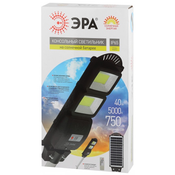 ЭРА Консольный светильник на солн. бат.,COB,с кронштейном,40W,с датч.движ., ПДУ,750lm, 5000К, IP66 (