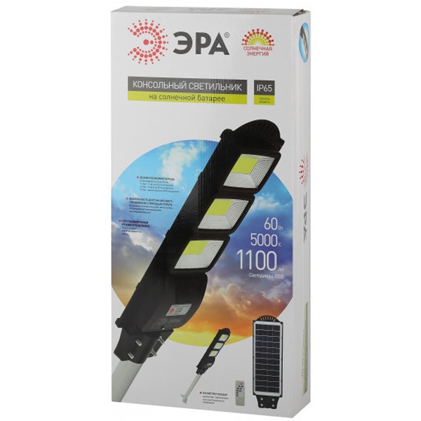 ЭРА Консольный светильник на солн. бат.,COB,с кронштейном,60W,с датчи. движ.,ПДУ,1100lm, 5000К, IP65