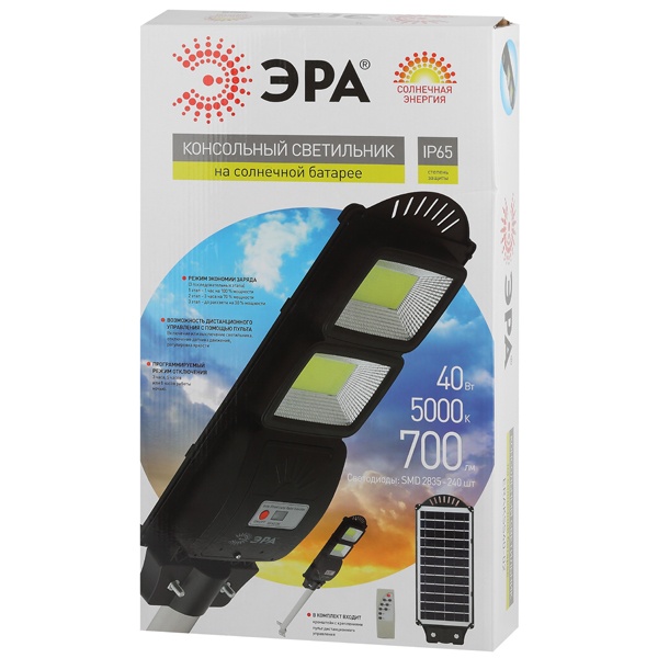 • Светильник консольный ЭРА SMD 40W 700Lm 5000K IP66 ПДУ на солнечной батарее с датчиком движения