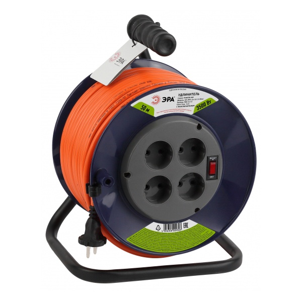 Удлинитель бытовой на пластиковой катушке длиной 50 метров, с сечением 2x1,5 мм2, 4 двухполюсные розетки с тепловой защитой, Эра. Б0046831