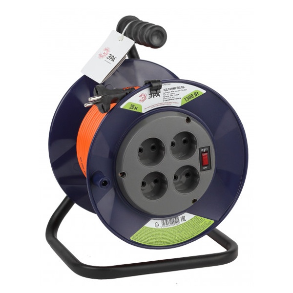 Удлинитель бытовой на пластиковой катушке длиной 20 метров, с сечением 2x0,75 мм2, 4 двухполюсные розетки с тепловой защитой, Эра. Б0046841