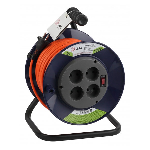 Удлинитель бытовой на пластиковой катушке длиной 30 метров, с сечением 2x1 мм2, 4 двухполюсные розетки с тепловой защитой, Эра. Б0046843