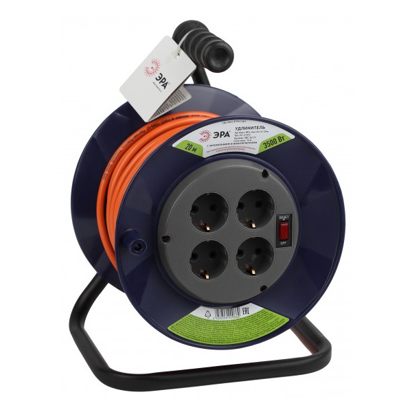 Удлинитель бытовой на пластиковой катушке длиной 20 метров, с сечением 3x1,5 мм2, 4 розетки с заземлением, с тепловой защитой, Эра. Б0046849