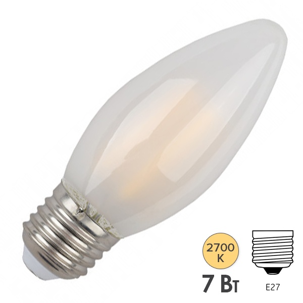 Энергосберегающая LED лампочка свеча с нитевидными светодиодами, мощностью 7 Ватт, с цоколем E27, теплый свет, матовая колба Б0046989