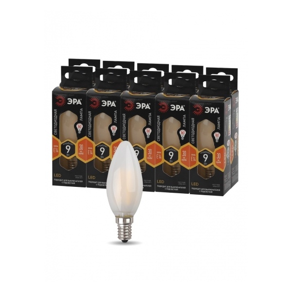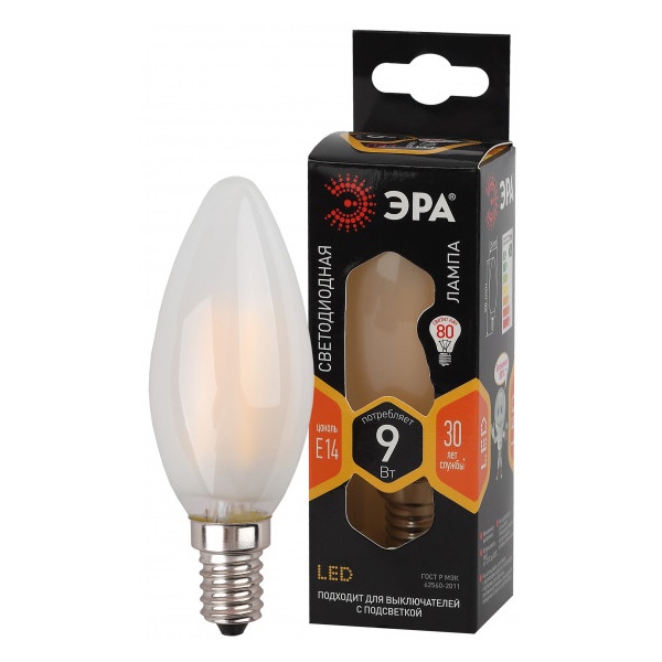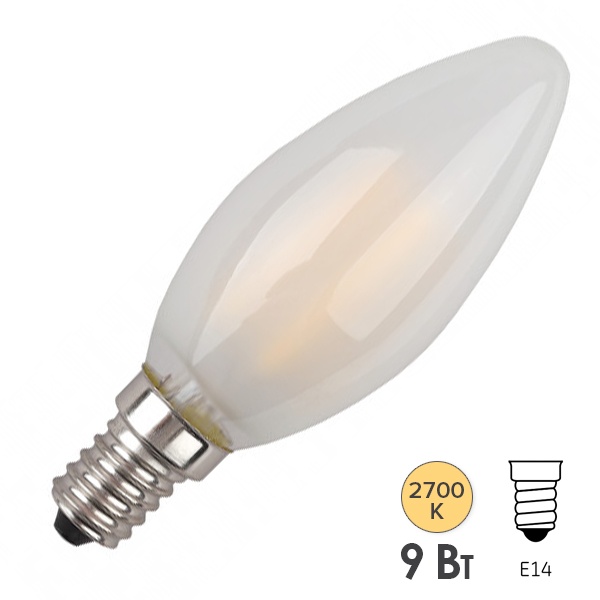 Энергосберегающая LED лампочка свеча с нитевидными светодиодами, мощностью 9 Ватт, с цоколем E14, теплый свет, матовая колба Б0046992