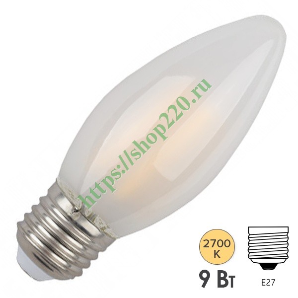 Энергосберегающая LED лампочка свеча с нитевидными светодиодами, мощностью 9 Ватт, с цоколем E27, теплый свет, матовая колба Б0046994
