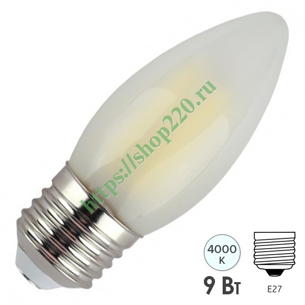 Энергосберегающая LED лампочка свеча с нитевидными светодиодами, мощностью 9 Ватт, с цоколем E27, нейтральный белый свет, матовая колба Б0046998