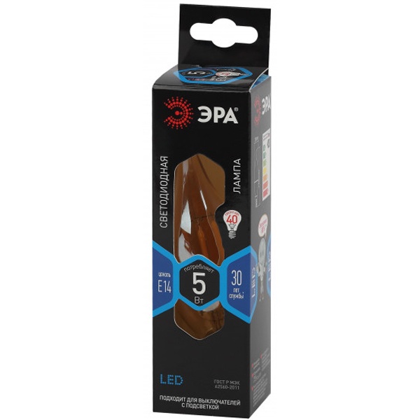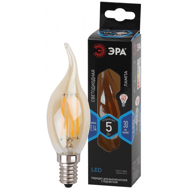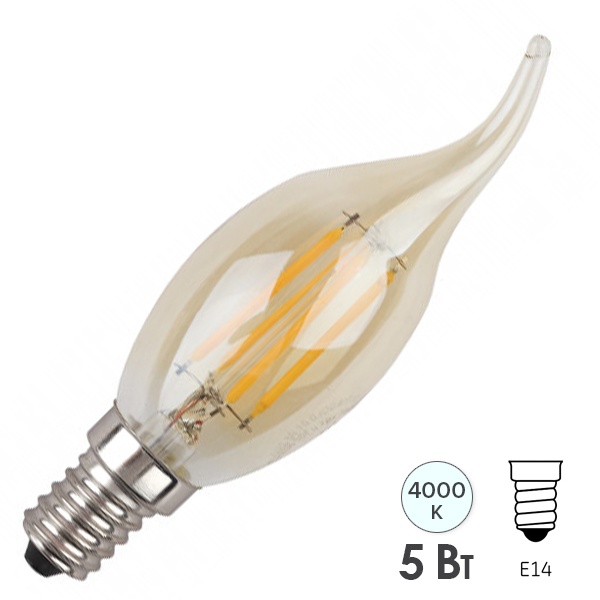 Винтажная (ретро) лампочка свеча на ветру ERA с нитевидными светодиодами, золотистая колба, мощностью 5 Ватт, с цоколем E14, нейтральный белый свет Б0047007