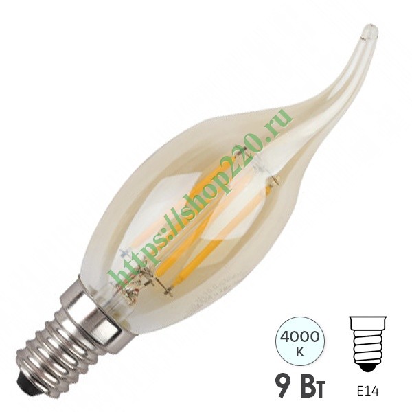 Светодиодная винтажная (ретро) лампочка свеча на ветру ERA с нитевидными светодиодами, золотистая колба, мощностью 9 Ватт, с цоколем E14, нейтральный белый свет Б0047010