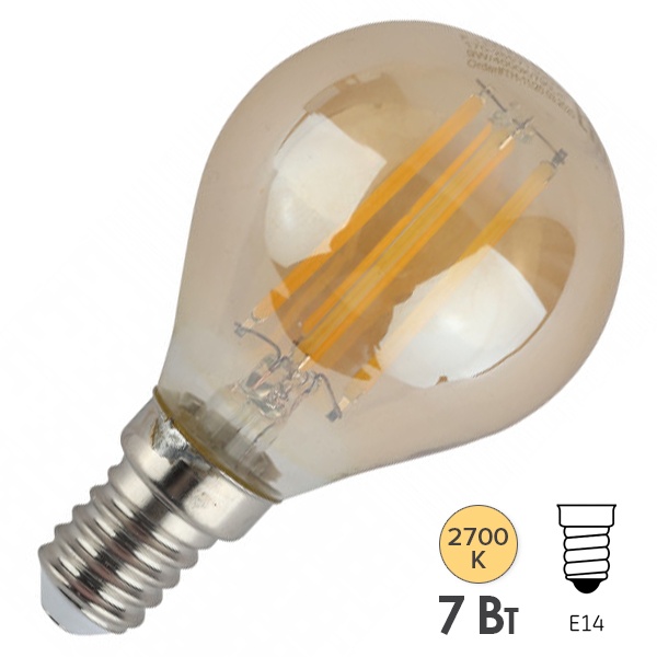 Светодиодная винтажная (ретро) лампочка шарик ERA с нитевидными светодиодами, золотистая колба, мощностью 7 Ватт, с цоколем E14, теплый свет Б0047016.