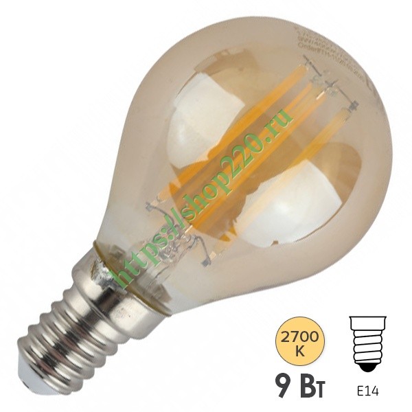 Светодиодная винтажная (ретро) лампочка шарик ERA с нитевидными светодиодами, золотистая колба, мощностью 9 Ватт, с цоколем E14, теплый свет Б0047022