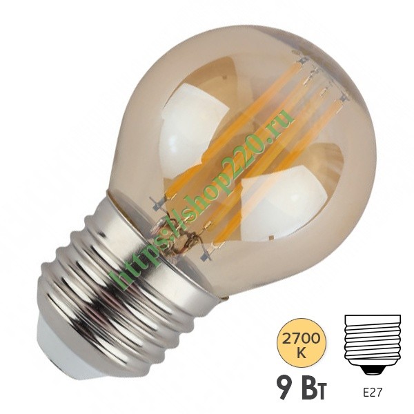 Светодиодная винтажная (ретро) лампочка шарик ERA с нитевидными светодиодами, золотистая колба, мощностью 9 Ватт, с цоколем E27, теплый свет Б0047025